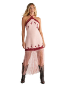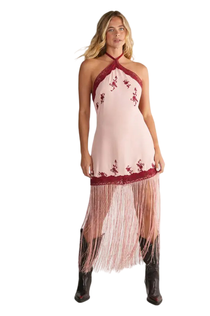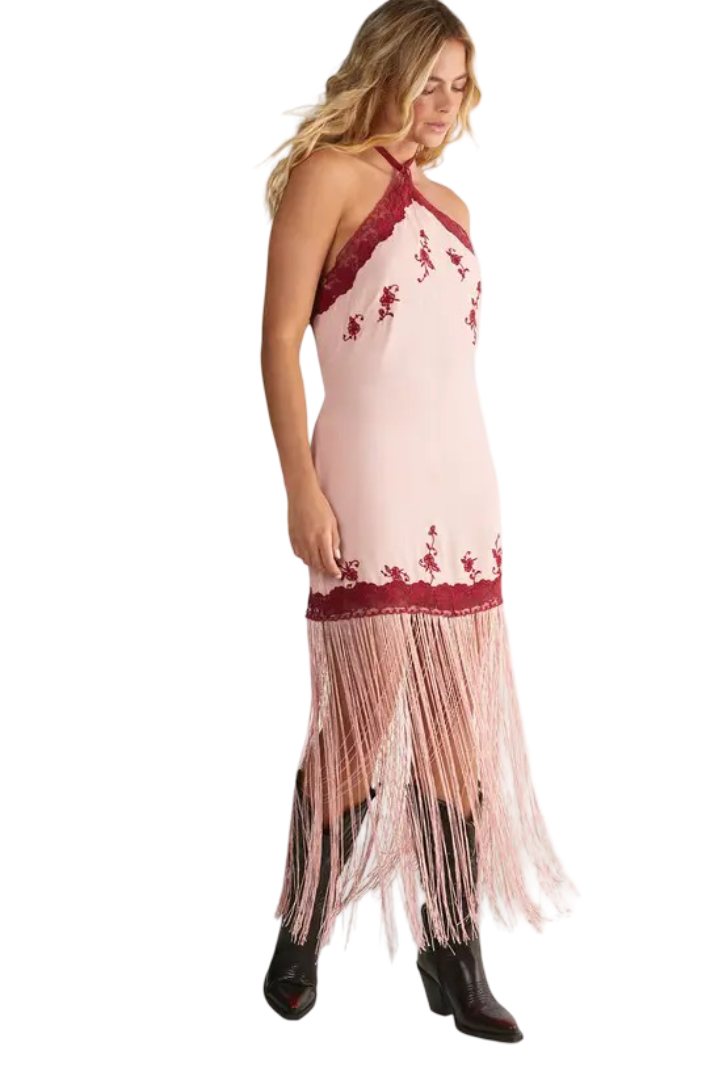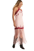 Make a captivating entrance with this beautifully crafted Floral Embroidered Halterneck Maxi Dress, designed for women who love timeless style with a bold, modern edge. The halterneck cut highlights your shoulders with sophistication, while the delicate floral embroidery and lace trimming bring an artisanal charm to the entire look. Its sleek viscose Morrocain fabric skims the body for a flattering silhouette, and the dramatic fringe hem brings mesmerizing movement that turns every step into a moment. From daytime events to special celebrations, this dress effortlessly adapts to your style pair it with western boots for attitude or opt for trainers and a denim jacket for a relaxed weekend vibe.